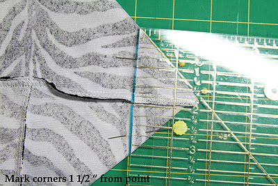 Mark 1.5" down from the corner as in picture below and mark of the corner, this is where you are going to sew. Mark all corners, both on your bag and your lining.