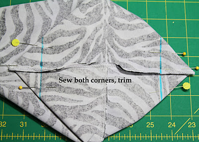 Sew both corners and then trim. Do the same with the fabric and the lining fabric. Be careful not to sew the corners down onto the bag.