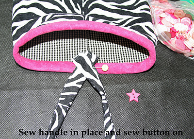 Sew the handle by folding it in half length wise and securing the ends. Pin the handle to the inside of the back of the bag at the top. Sew the button on.